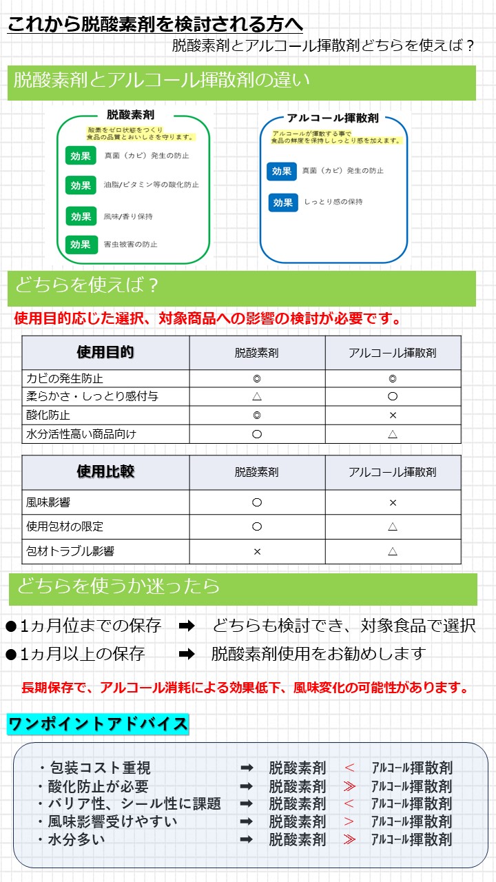 Q脱酸素剤を使用すると食品が乾く(パサパサする)ので、アルコール揮散剤を使用したいのですが?