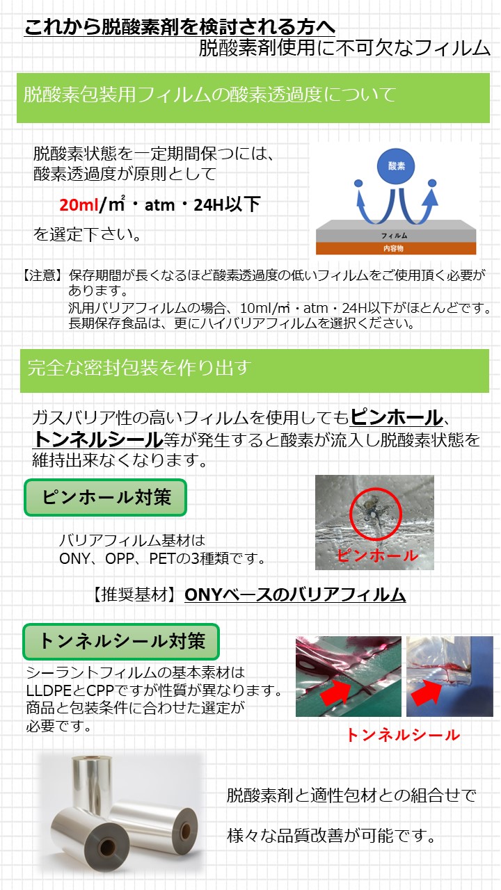 関連技術資料:脱酸素剤 有機系脱酸素剤 酸素検知剤付脱酸素剤 アルコール揮散併用型脱酸素剤
